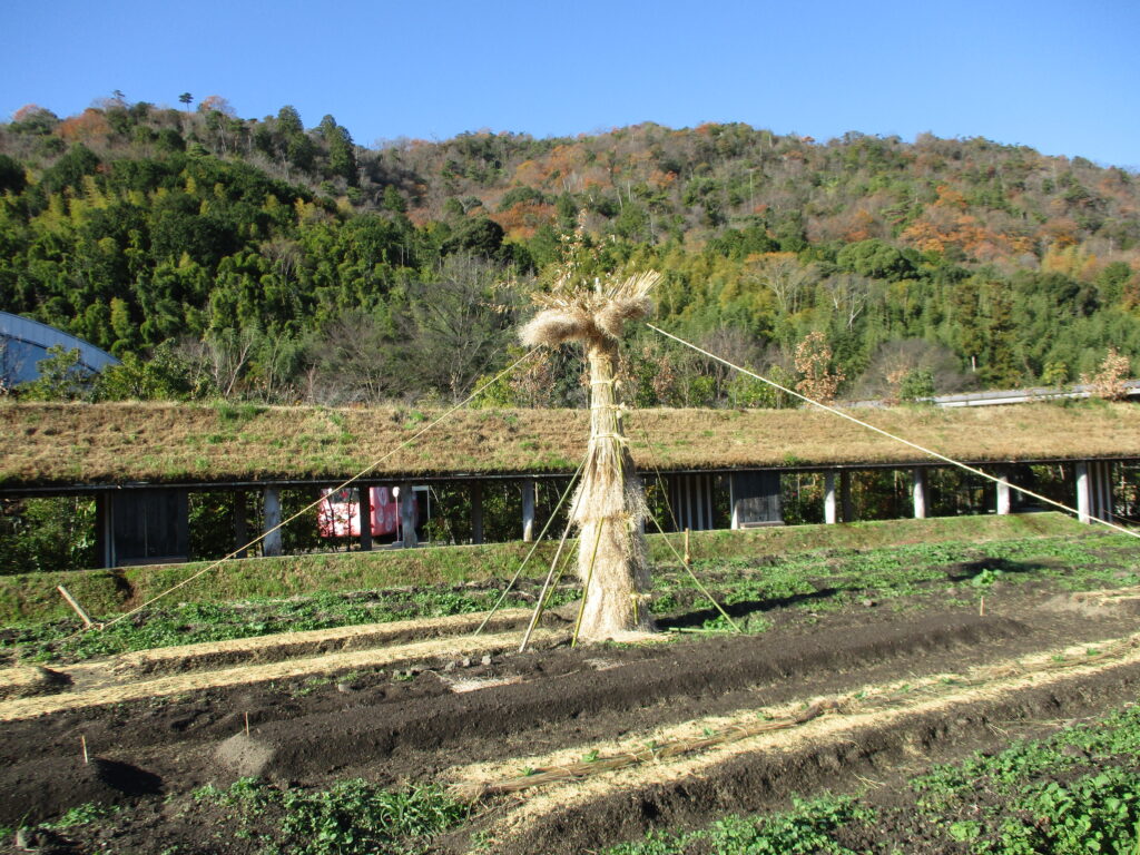 初めに、ラ コリーナ近江八幡の見学を行いました。敷地内には、近江八幡市の伝統文化である大きな松明を展示されていたり、田んぼや畑では、実際に農作物を栽培されていたりと、自然や地域の伝統文化との調和・共生に取り組まれていることを教えていただきました。
