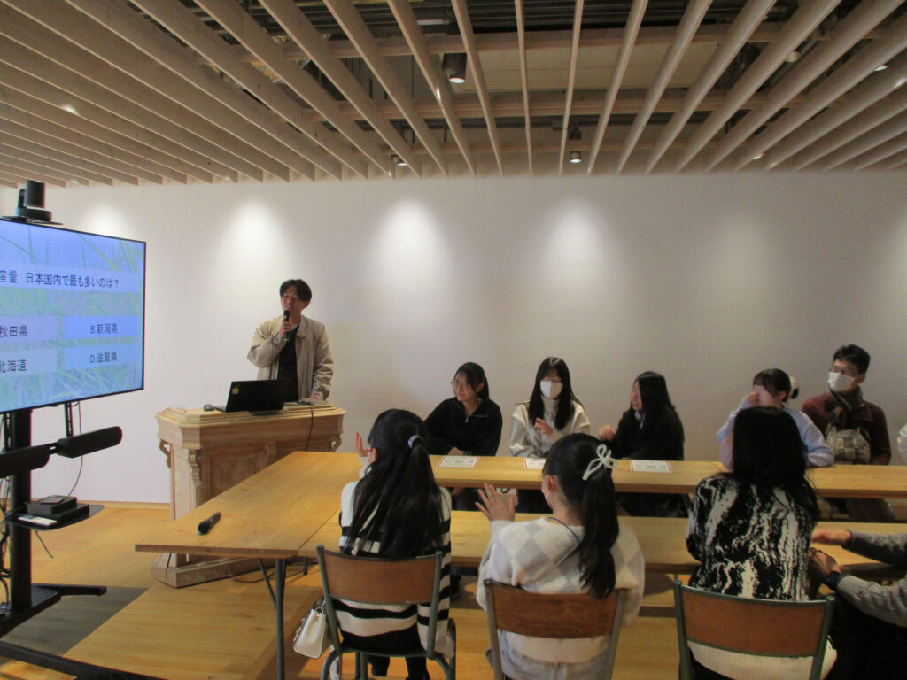 その後、今回は特別に本社へお招きいただき、たねやグループの構成や社是・社訓、5つのサステナブルビジョンについて説明いただきました。続いて、たねやの農業部門であるキャンディファームで勤務されている社員の方から業務内容とご自身の経歴についてお話いただきました。大学で学ばれた知識が、特色ある菓子作りや地域貢献において、いかに活かされているかをお話しいただき、理系での学びが、広い分野での貢献につながっているという、魅力的な内容でありました。