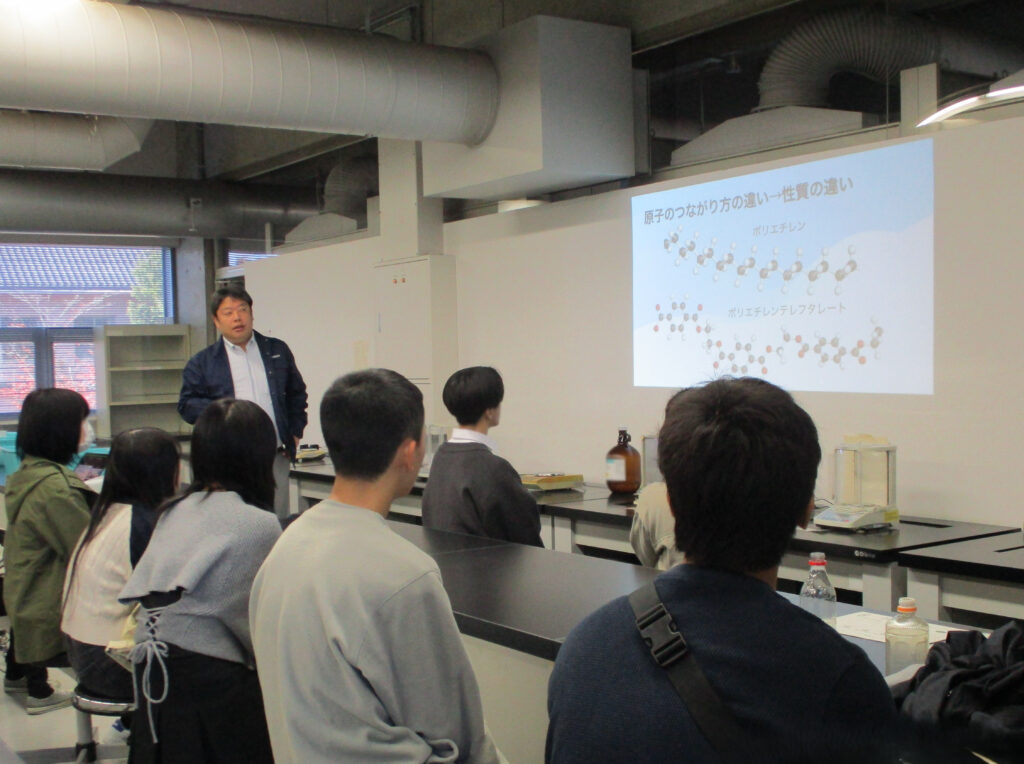 中高生とそのご家族あわせて11名の方に参加いただき実施しました。様々な高分子の結晶がみせる構造を顕微鏡で観察するとともに、ボトル部位の材質や性質を測定する実験を行い、ペットボトルに込められた技術とリサイクルの課題について学びました。
