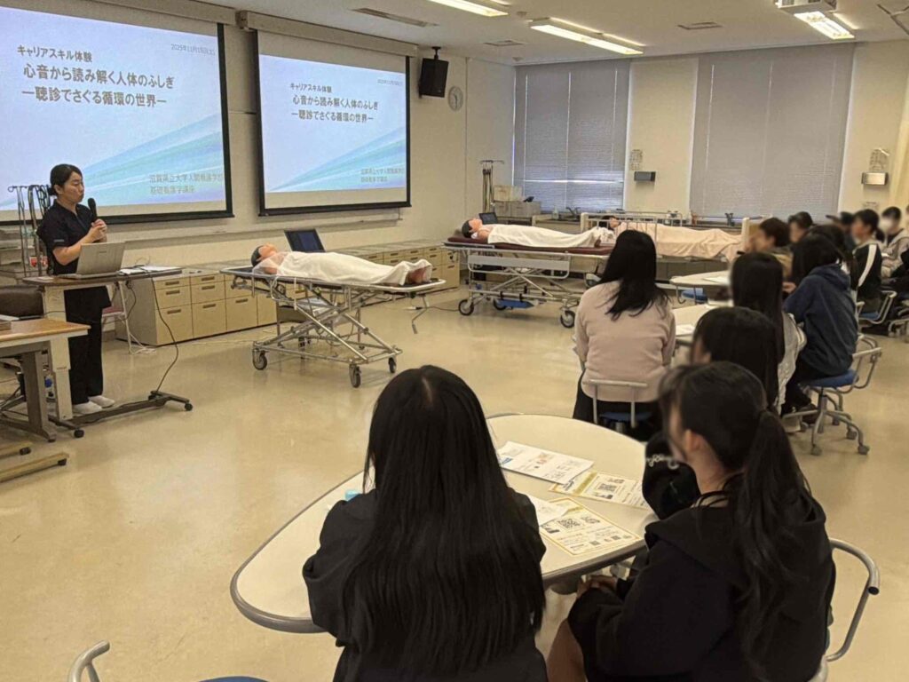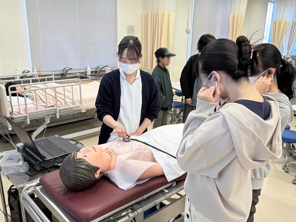 心臓の機能と仕組みについて、学部生への授業と同じような内容を実施しました。体験では、聴診器・医療訓練用シミュレータを使用し、心臓が悪い方の心音等を聴いていただきました。