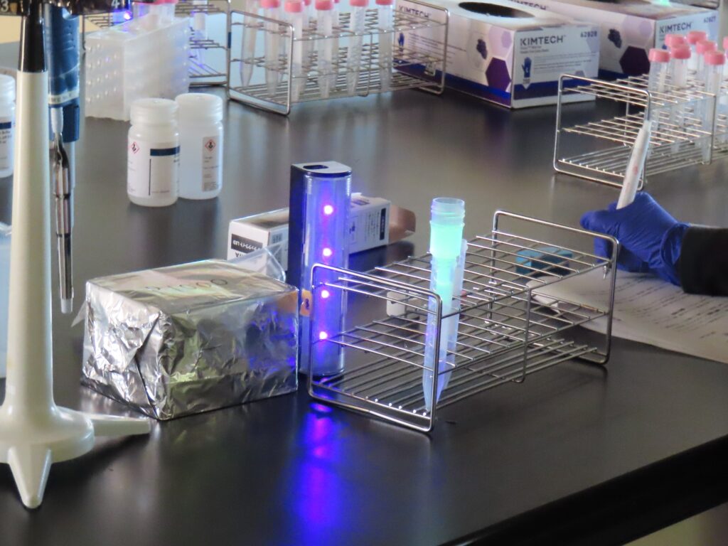 大腸菌で発現させたHisタグ付き緑色蛍光タンパク質をカラムクロマトグラフィーで精製しました。タンパク質用の電気泳動装置や濃度測定用プレートリーダーなども見学し、欲しいタンパク質を大量生産する技術の流れを勉強しました。